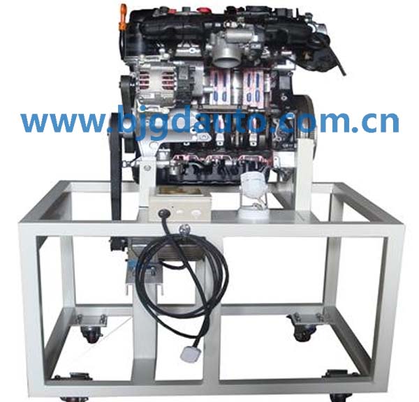 設備采用電控發動機總成實物制作,發動機的關鍵部位加以爆炸式解剖,解剖剖面采用硬拉絲鍍膜工藝、精細分色,內部和外部機件電鍍處理,其他部件鈍化防腐,根據用戶要求采用各種材質、各種形狀的底座。發動機采用減速電機驅動。配置射燈直觀、清晰觀察發動機的組成和機構的運動關系,采用光電程控技術,通過LED燈顯示發動機各缸工作狀態。氣缸、活塞、曲軸連桿、凸輪軸、進氣門、排氣門、氣門頂、火花塞、噴油器、進氣歧管、排氣歧管、發電機、機油泵、水泵、節溫器、噴油嘴、節氣門體等內部結構清晰可見。利用本實驗臺可以使學員輕松、真實地了解發動機機械系統的組成、各部件的外形、各機構彼此之間的連接和運動關系,加深學生對發動機機械系統組成和工作原理的理解,幫助學生理解抽象的控制理論。本實驗臺制作精致,設計合理,安全可靠,教學功能完備,是各類培訓機構講授汽車發動機結構課程的理想教學平臺。