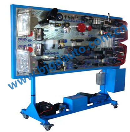 設備由兩部分組成,示教板和電路圖板通過航空插頭連接,可以實現各個端子的電阻、電壓等數據檢測;電路圖板繪有車身電路圖解,相應故障點配置LED故障終端顯示。