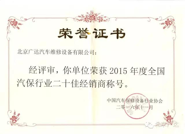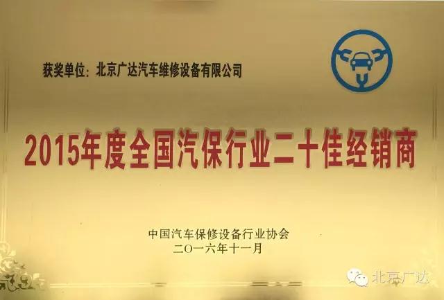 北京廣達榮獲2015年度全國汽保行業20佳經銷商稱
