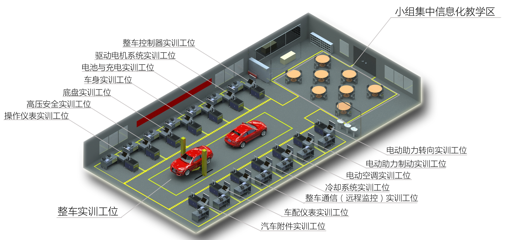 流水線型BEV實訓系統(Flow Lined Vocational PracticeSystem of BEV)簡稱FLVPS,由總計13個實訓工位構成。FLVPS系統構成了職業教育及應用型本科教育新能源電動汽車技術專業或車輛工程類專業新能源汽車技術方向的綜合實訓所需手段的綜合解決方案,為學校提供實訓所需軟件硬件一體化的系統完整的教育技術平臺。系統按德國行動導向的職業教育思想和理念開發設計,支撐以項目教學方法為主、引導文、案例和角色扮演為輔的行動導向教學方法,突出“做中學”和“學中做”,不是在現成設備上學習,而是在做設備的過程中學習。系統依據電動汽車維修職業行動領域決定的對知識和技能的需求,支持開展構造認知、原理研討、拆裝操作、運行操作、檢測操作、維修操作、保險定損評定等實訓的開展。
